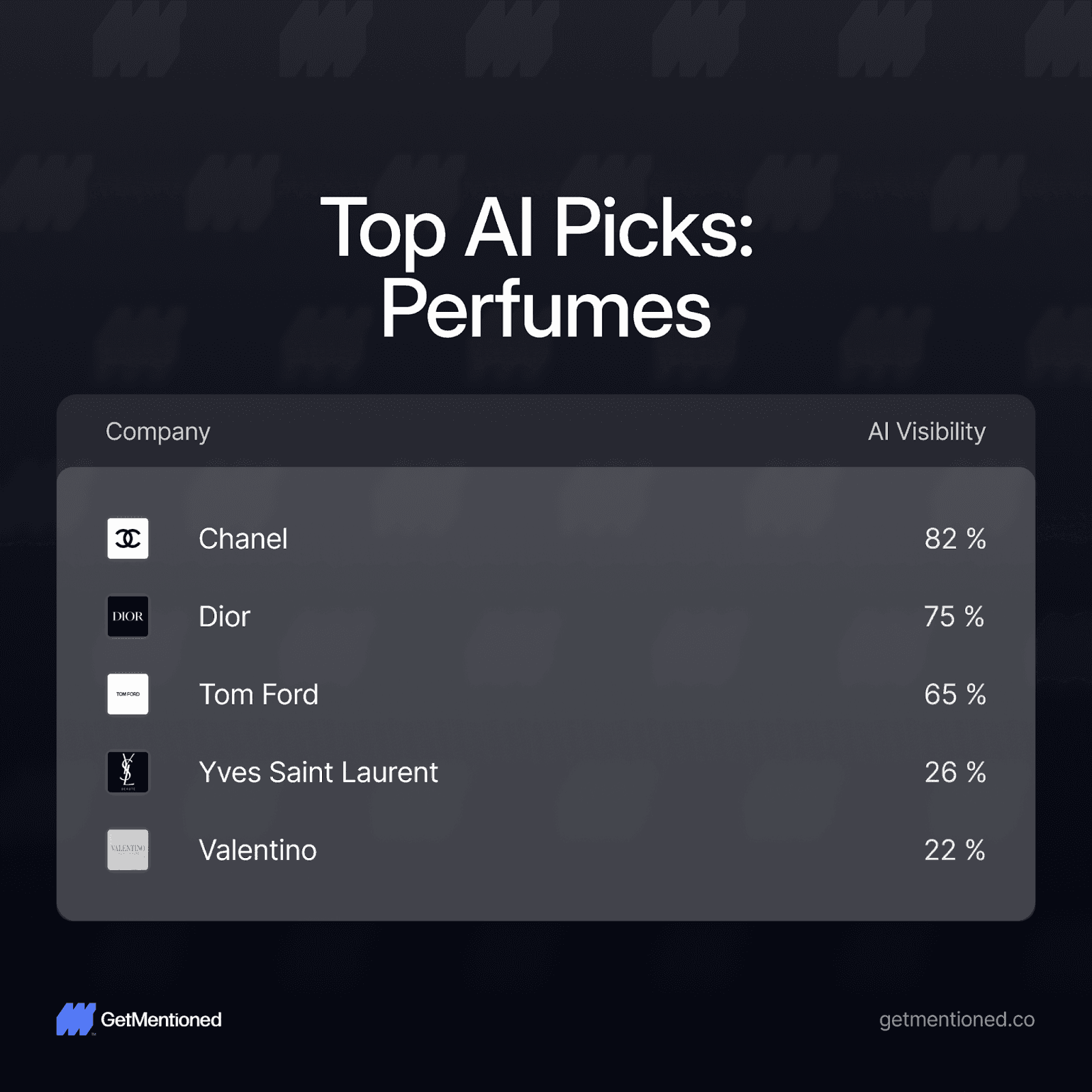The data also reveals some notable absences. Moët & Chandon - arguably the world's most famous champagne - sits at just 53% despite massive brand recognition. In perfumes, YSL and Valentino are below 30%. These are household names getting outperformed in AI recommendations.