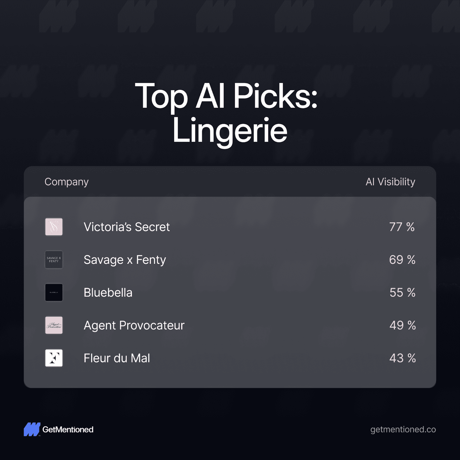 Lingerie: Victoria's Secret leads at 77%, proving the brand still has serious pull in AI recommendations despite its public reinvention narrative. Savage x Fenty (69%) is the strong runner-up - Rihanna's brand is clearly resonating with the sources AI trusts. Bluebella (55%), Agent Provocateur (49%), and Fleur du Mal (43%) complete the top 5.