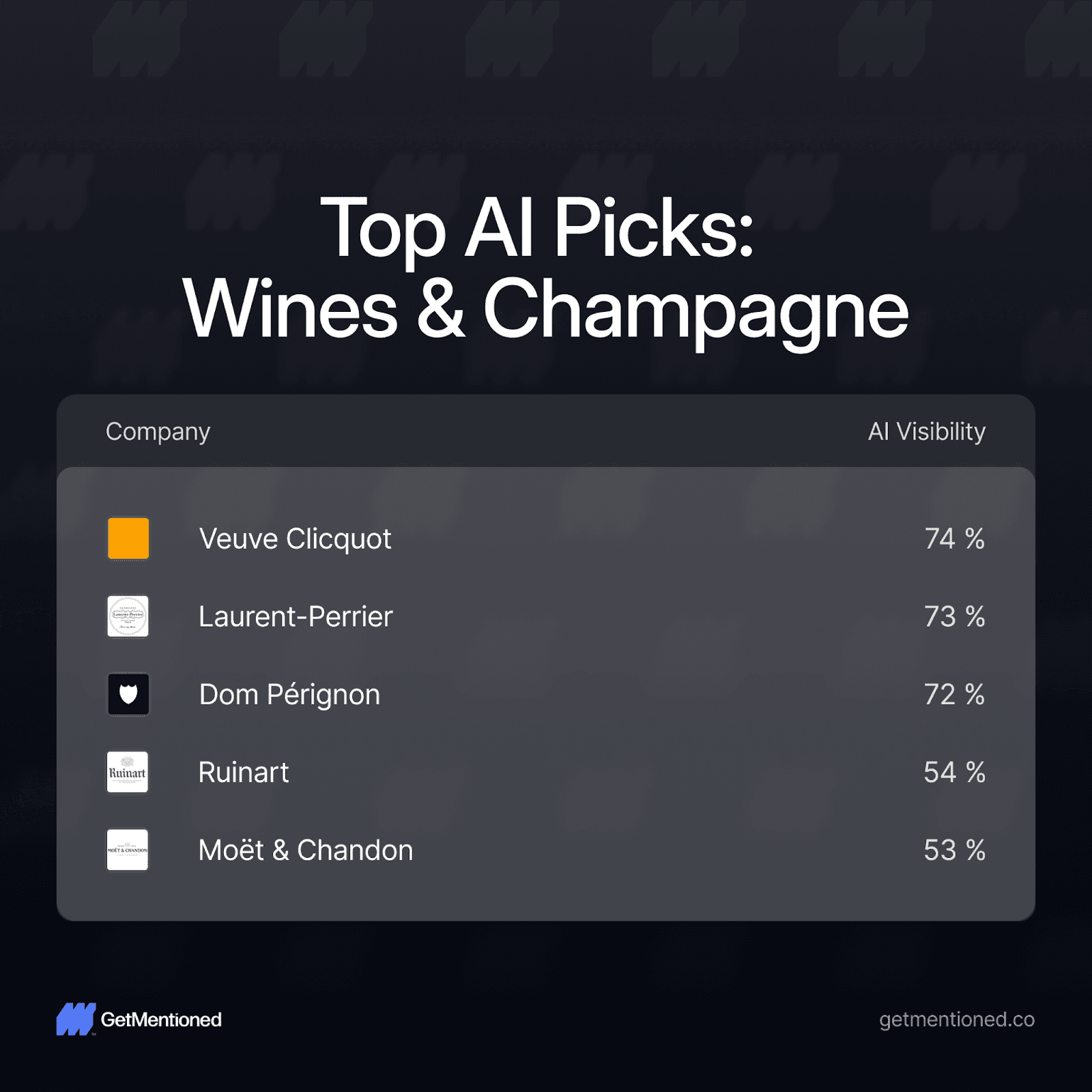Wines & Champagnes: This is the tightest race in our data. Veuve Clicquot (74%), Laurent-Perrier (73%), and Dom Pérignon (72%) are separated by just two percentage points. It's a three-way love triangle within the love triangle. Ruinart (54%) and Moët & Chandon (53%) sit a tier below - surprising for Moët, arguably the most recognizable champagne brand in the world.
