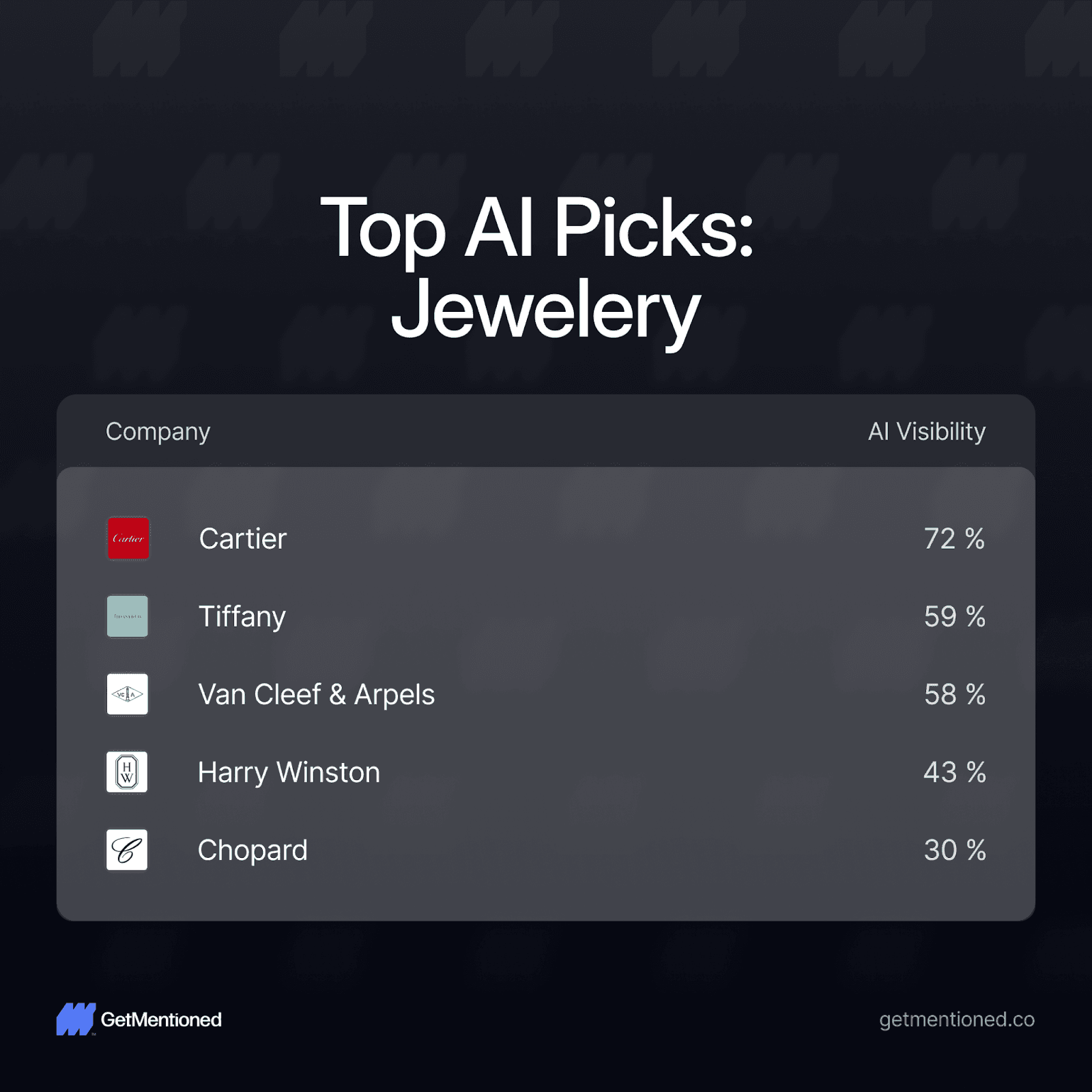 Jewelry: Cartier (72%) and Tiffany (59%) are the obvious power couple, but Van Cleef & Arpels at 58% is practically breathing down Tiffany's neck. Harry Winston (43%) and Chopard (30%) trail behind - luxury heritage alone isn't enough if AI's sources aren't talking about you.
