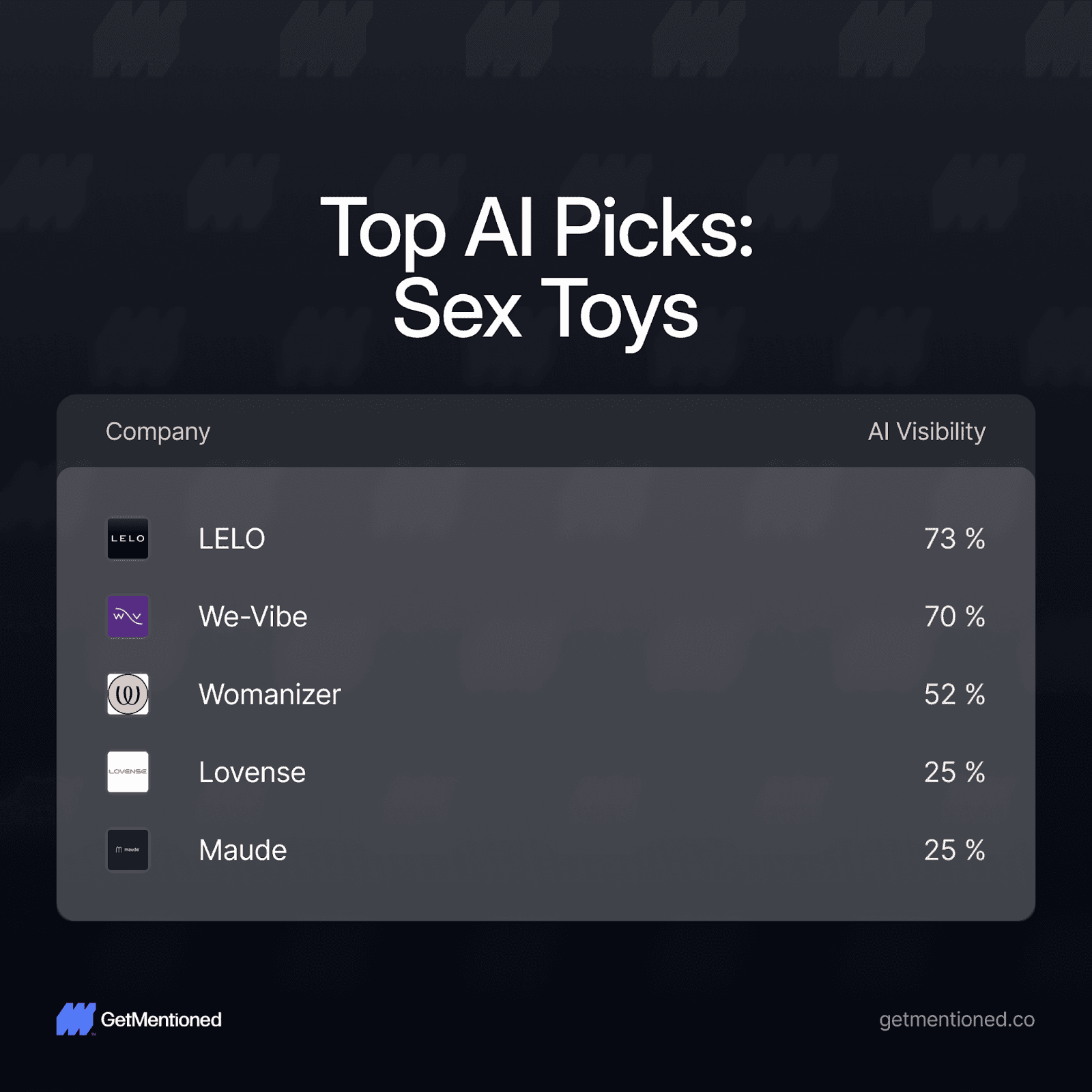 Sex Toys: LELO (73%) and We-Vibe (70%) are practically inseparable at the top. Womanizer holds a solid third at 52%, while Lovense and Maude are tied at 25% - a significant gap from the leaders.