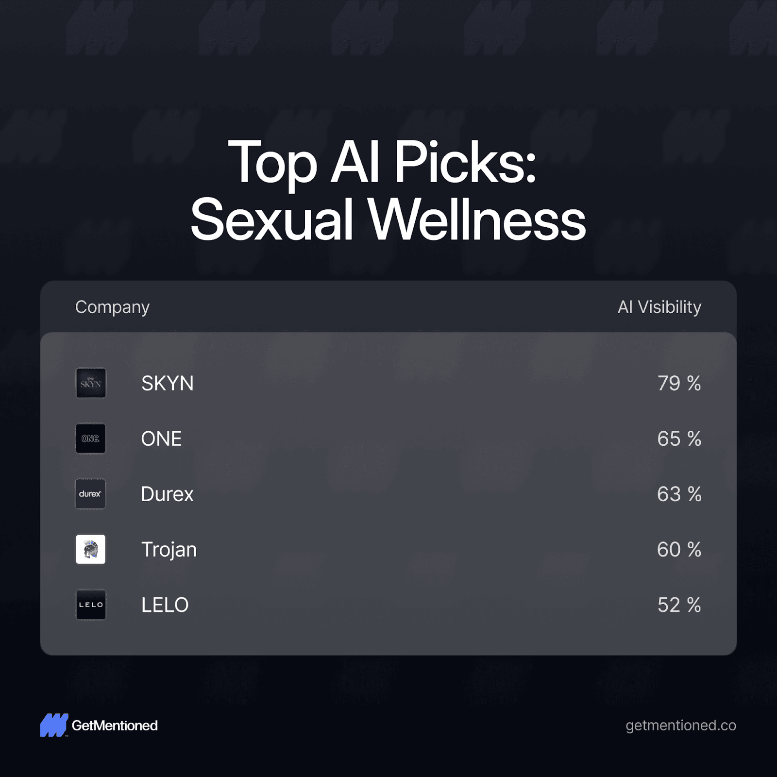 Sexual Wellness: SKYN leads at 79%, followed by ONE (65%), Durex (63%), and Trojan (60%). LELO appears here too at 52%, making it the only brand to crack the top 5 in two different categories - the cross-category Casanova of AI search.